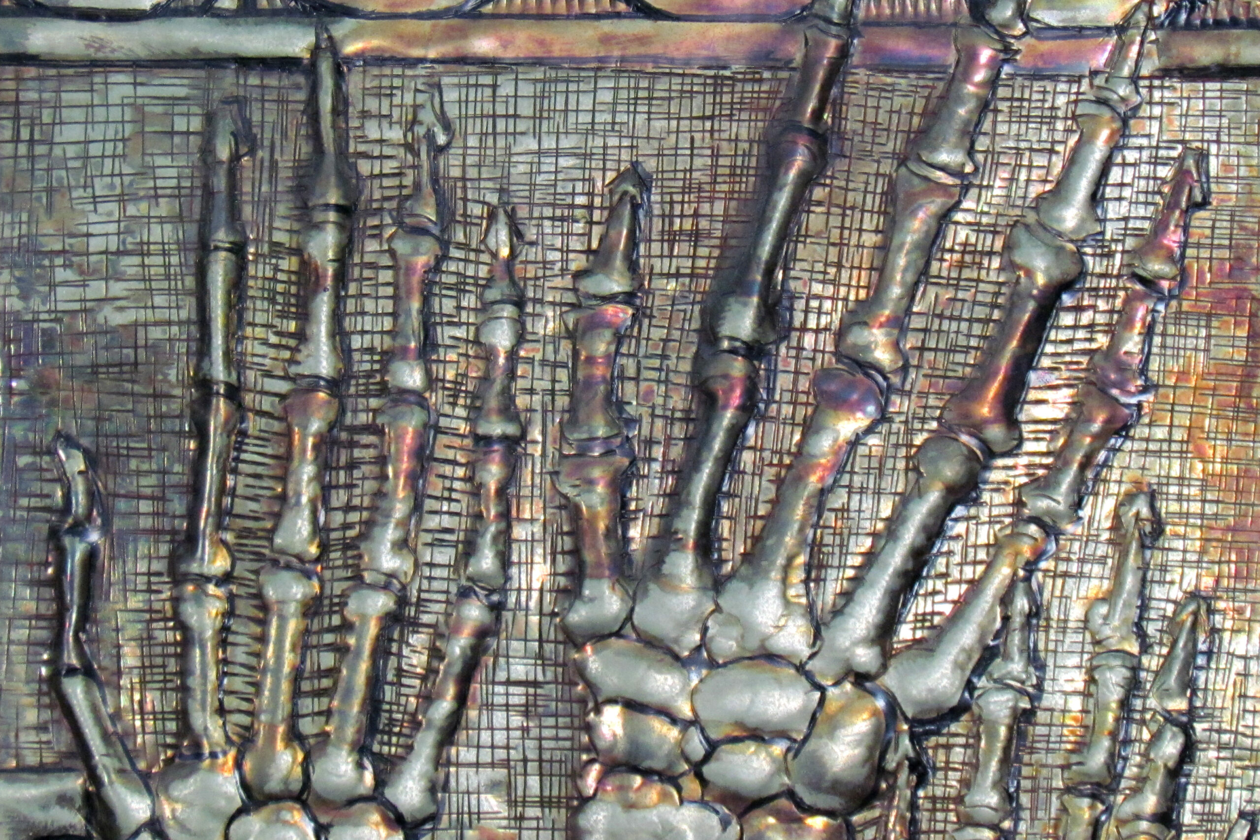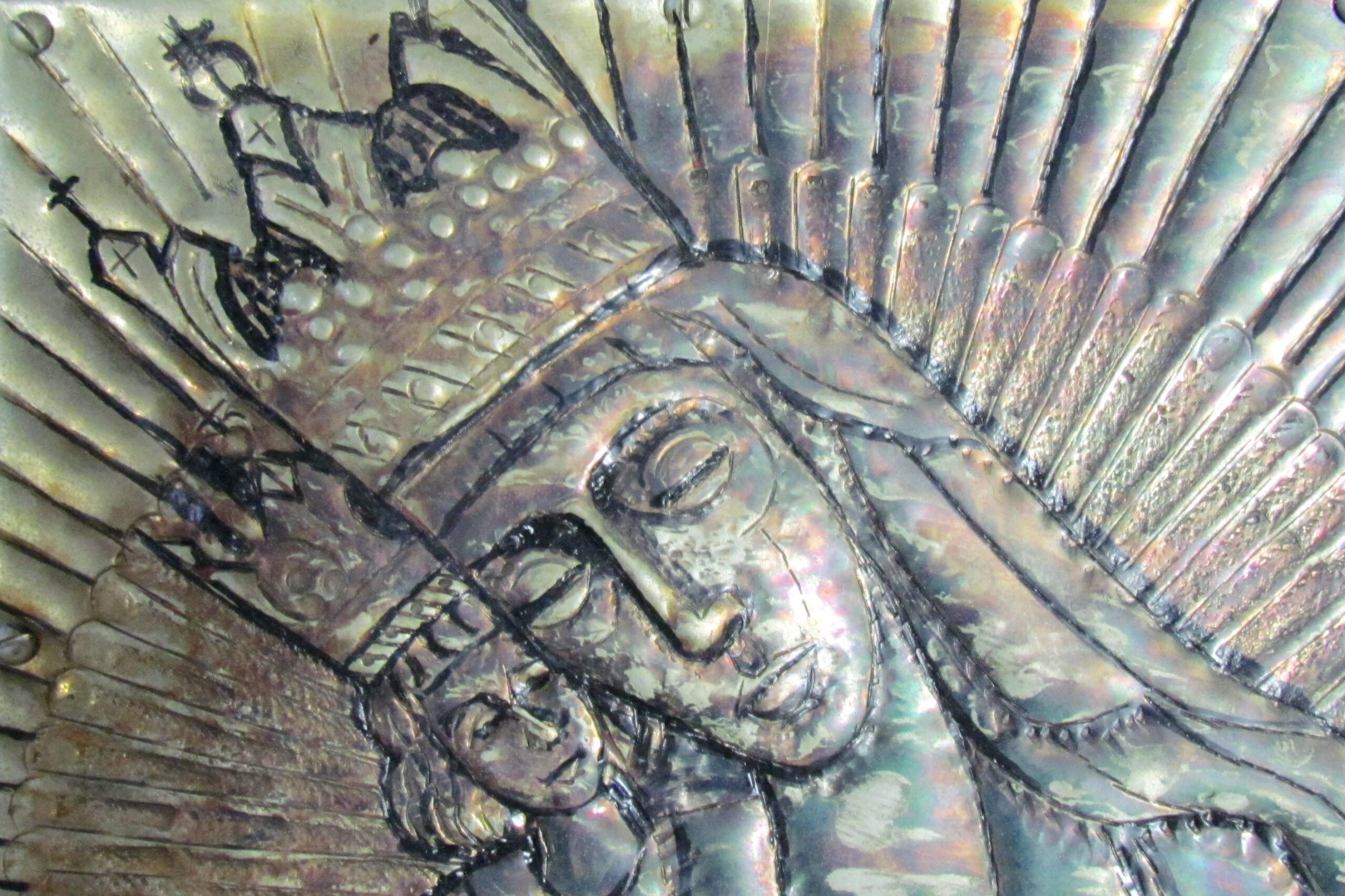 An adjustable vacuum was used at a very light setting to remove any loose debris, such as lint or dust from the surface. Cotton cloths and mild detergent were used to wipe away the oily accumulation of dust from the entire piece. Stubborn areas were dissolved with undiluted detergent and wiped away with cotton swabs and cloths. The copper plaque and the frame were coated with microcrystalline wax and buffed to compress the wax. This made almost no difference in the appearance of the plaque, but added some protection from corrosion and incidental soiling.