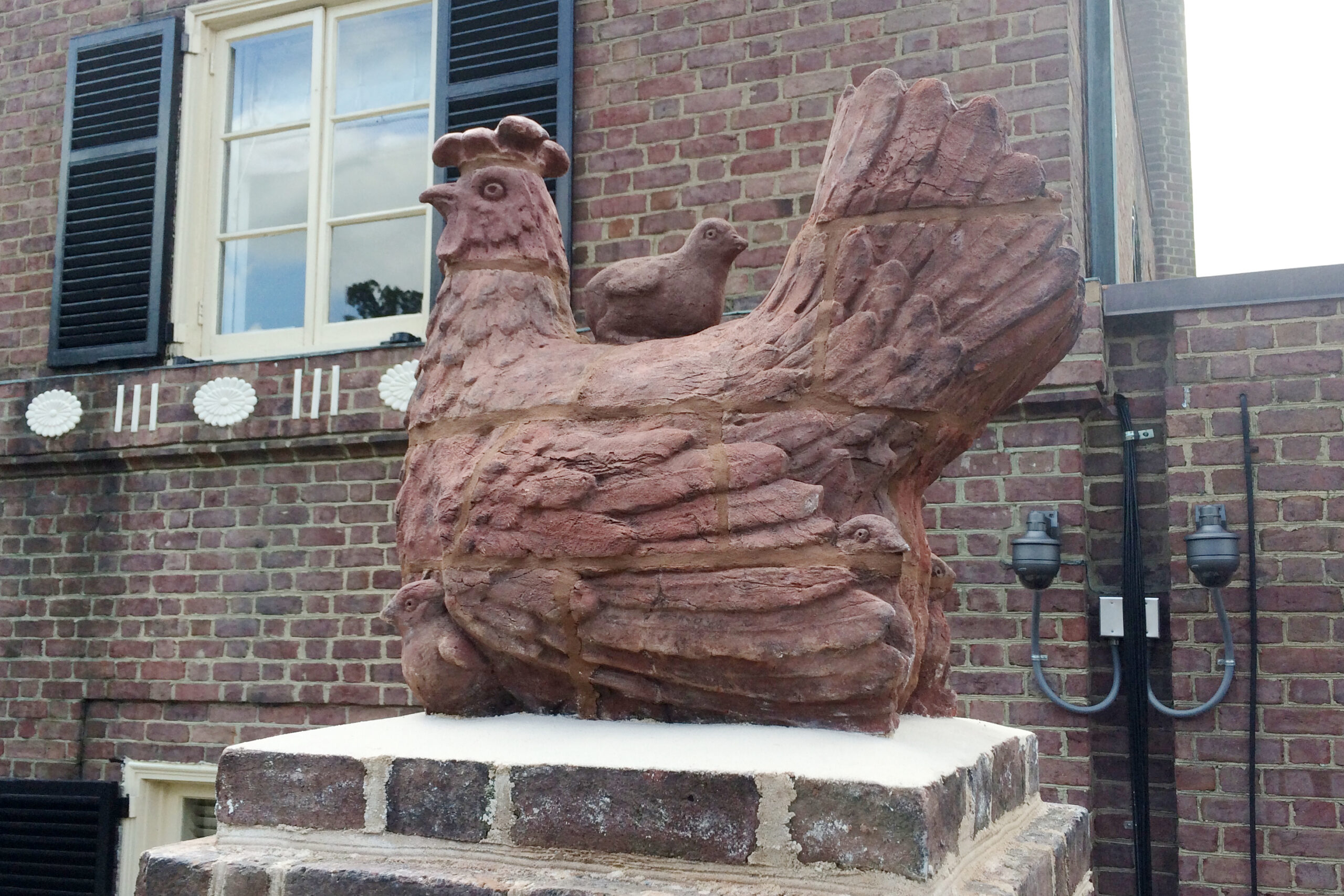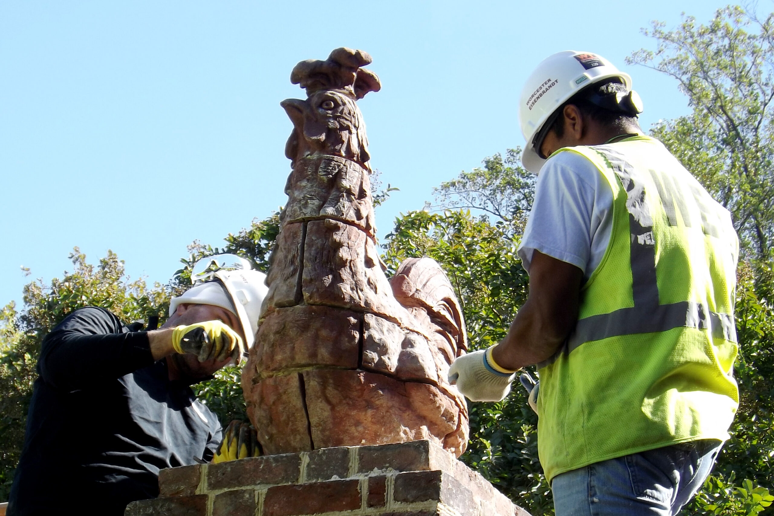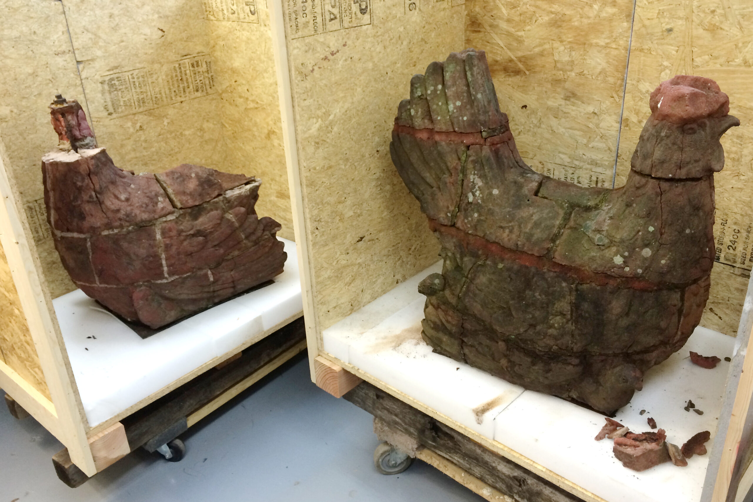 The chickens and all recoverable pieces were removed from the piers, crated, and brought to WEI’s Baltimore facility, where the sculptures were inventoried, cleaned, labelled, and assessed for damage. The loose top layers were completely disassembled to work on individual brick units, and at that time, a rusting armature was revealed. The mild steel armature was removed from the structure and replaced with a carbon fiber reinforcement. Cleanly broken units were repaired and returned to the assembly and occasionally patched to fill in losses. If units were irreparable, the conservation team made molds of the corresponding piece in the matching bird, and if both copies were missing the same piece, WEI sculpted new positives for molds. One piece that was missing completely was the crown of the hen. Based on the design of the existing pieces, WEI researched heirloom breeds to determine which one would be the best model for the new sculpt. All new pieces were cast in cement colored specially to match the color range of the existing bricks.