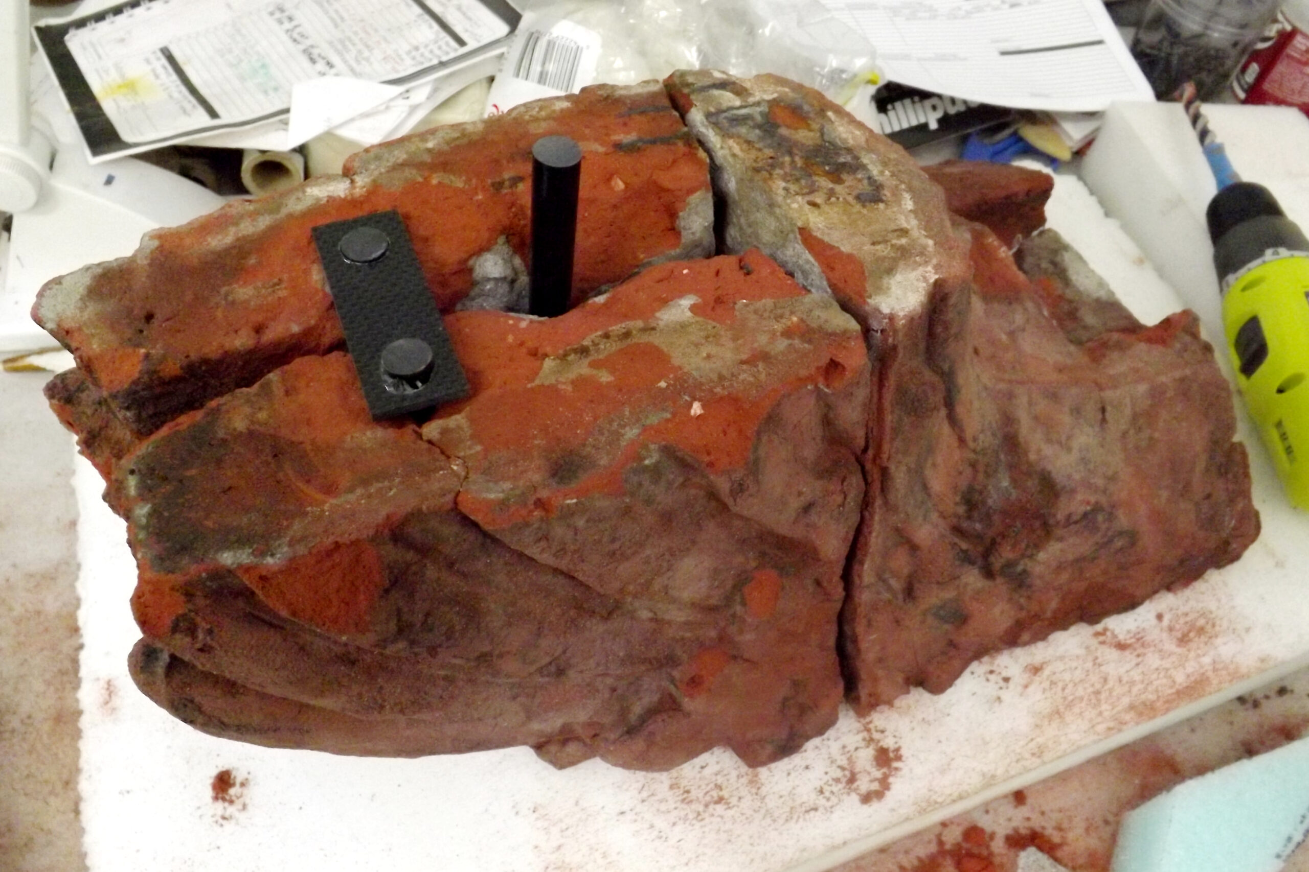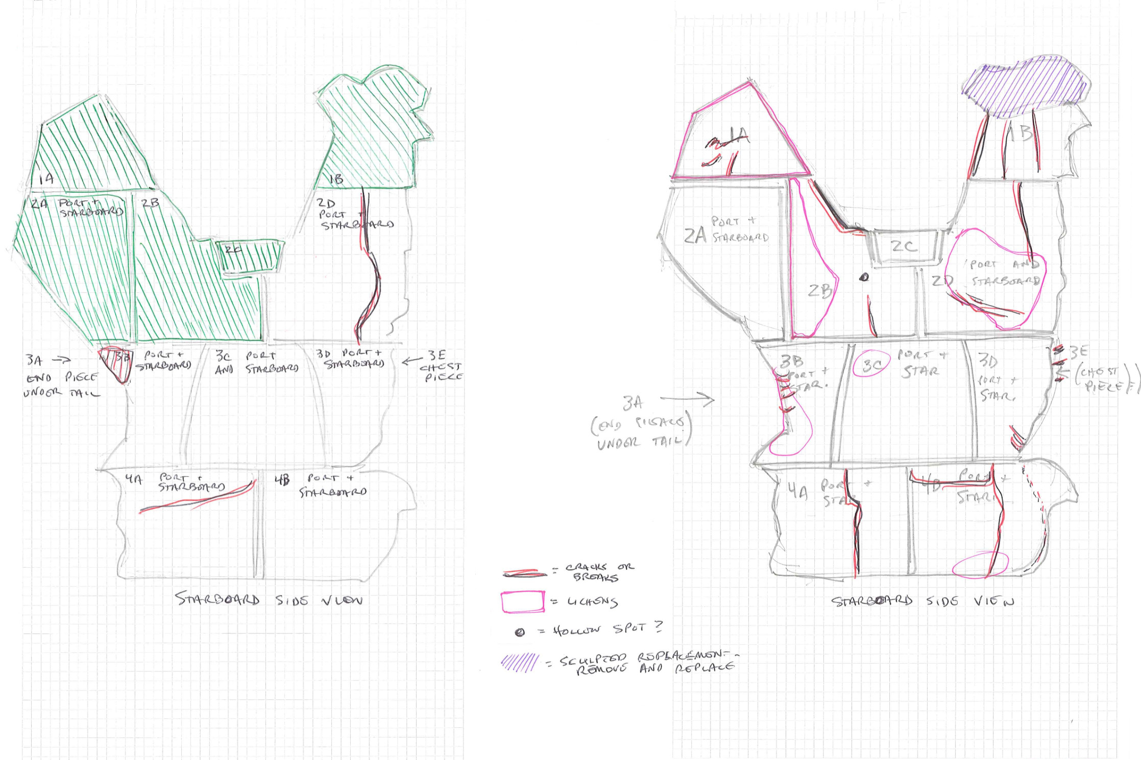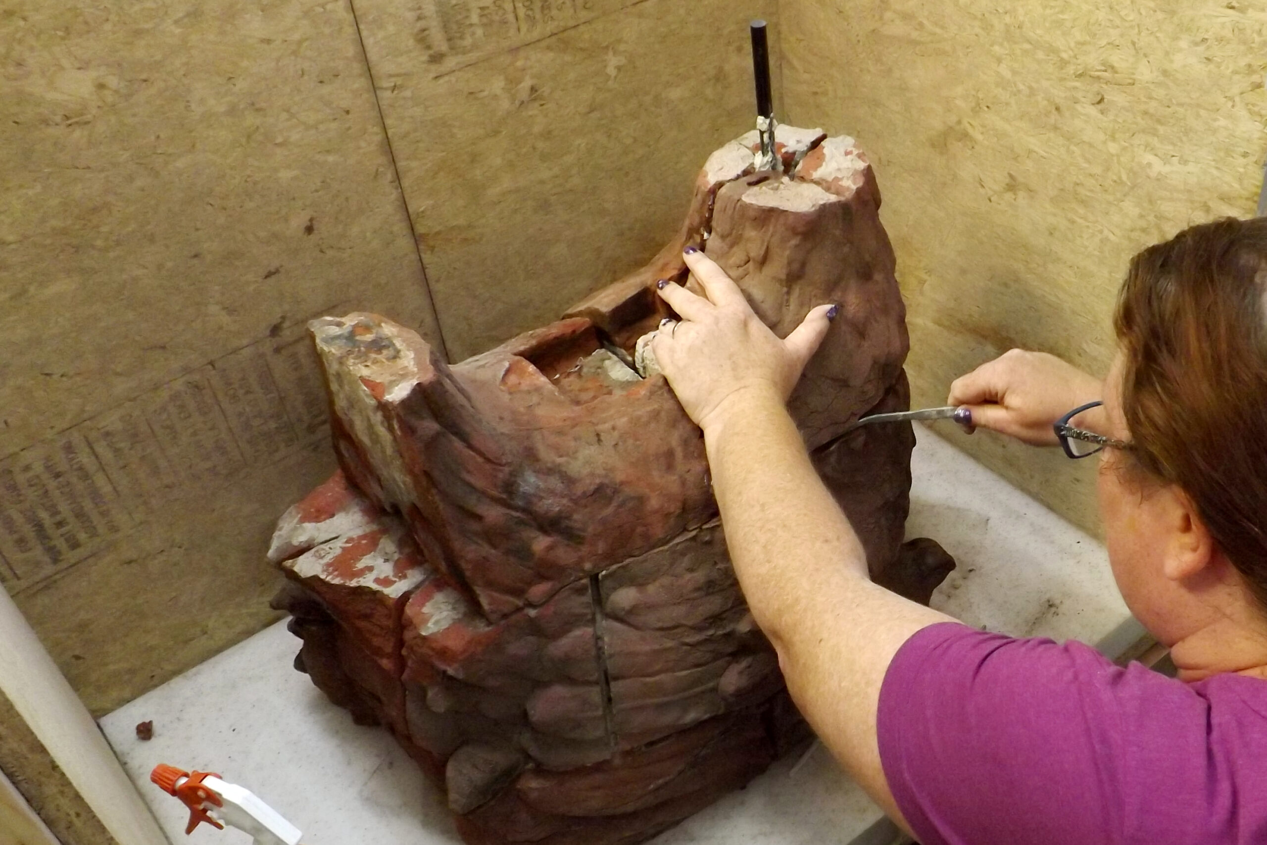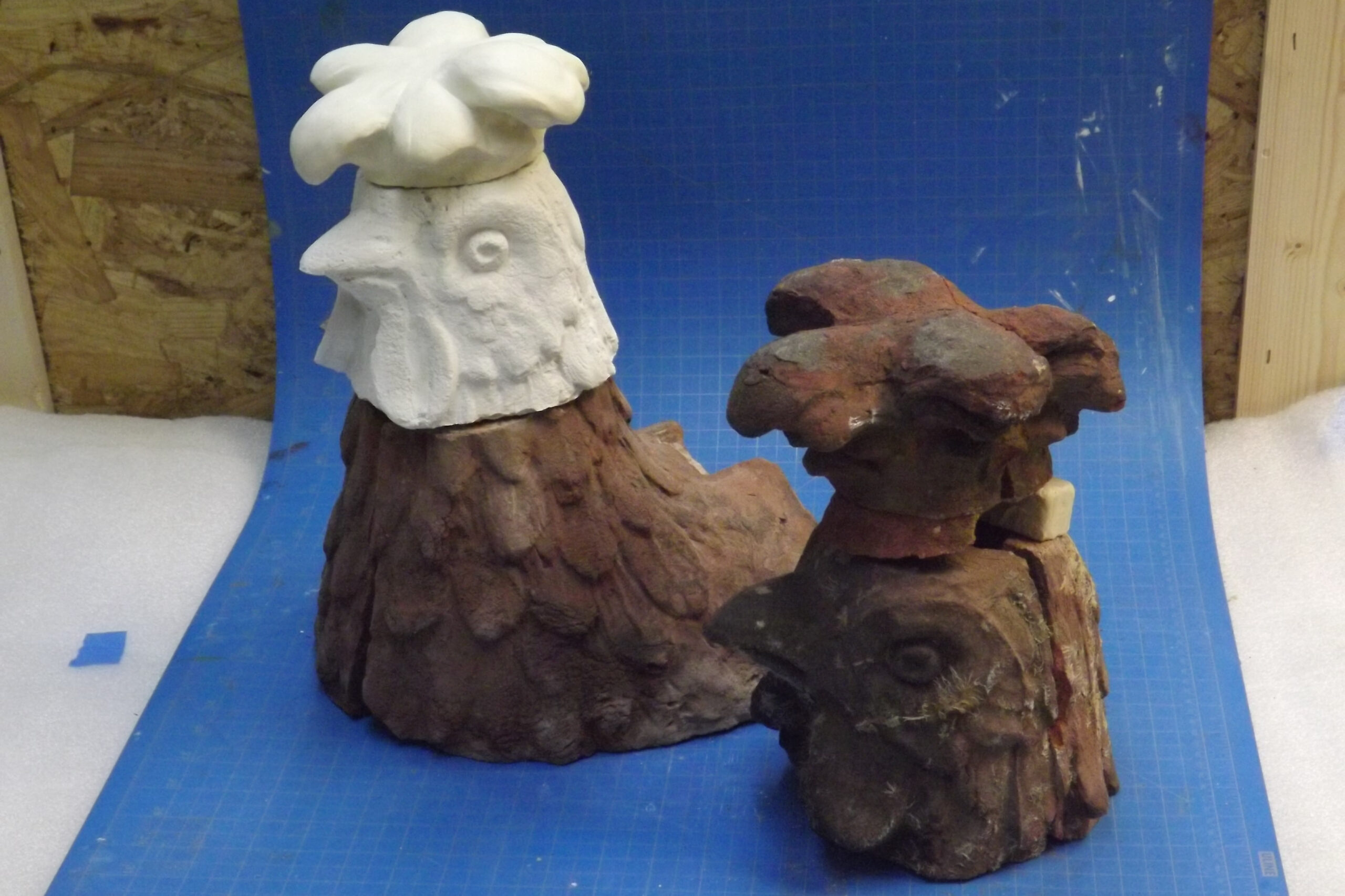 The chickens and all recoverable pieces were removed from the piers, crated, and brought to WEI’s Baltimore facility, where the sculptures were inventoried, cleaned, labelled, and assessed for damage. The loose top layers were completely disassembled to work on individual brick units, and at that time, a rusting armature was revealed. The mild steel armature was removed from the structure and replaced with a carbon fiber reinforcement. Cleanly broken units were repaired and returned to the assembly and occasionally patched to fill in losses. If units were irreparable, the conservation team made molds of the corresponding piece in the matching bird, and if both copies were missing the same piece, WEI sculpted new positives for molds. One piece that was missing completely was the crown of the hen. Based on the design of the existing pieces, WEI researched heirloom breeds to determine which one would be the best model for the new sculpt. All new pieces were cast in cement colored specially to match the color range of the existing bricks.