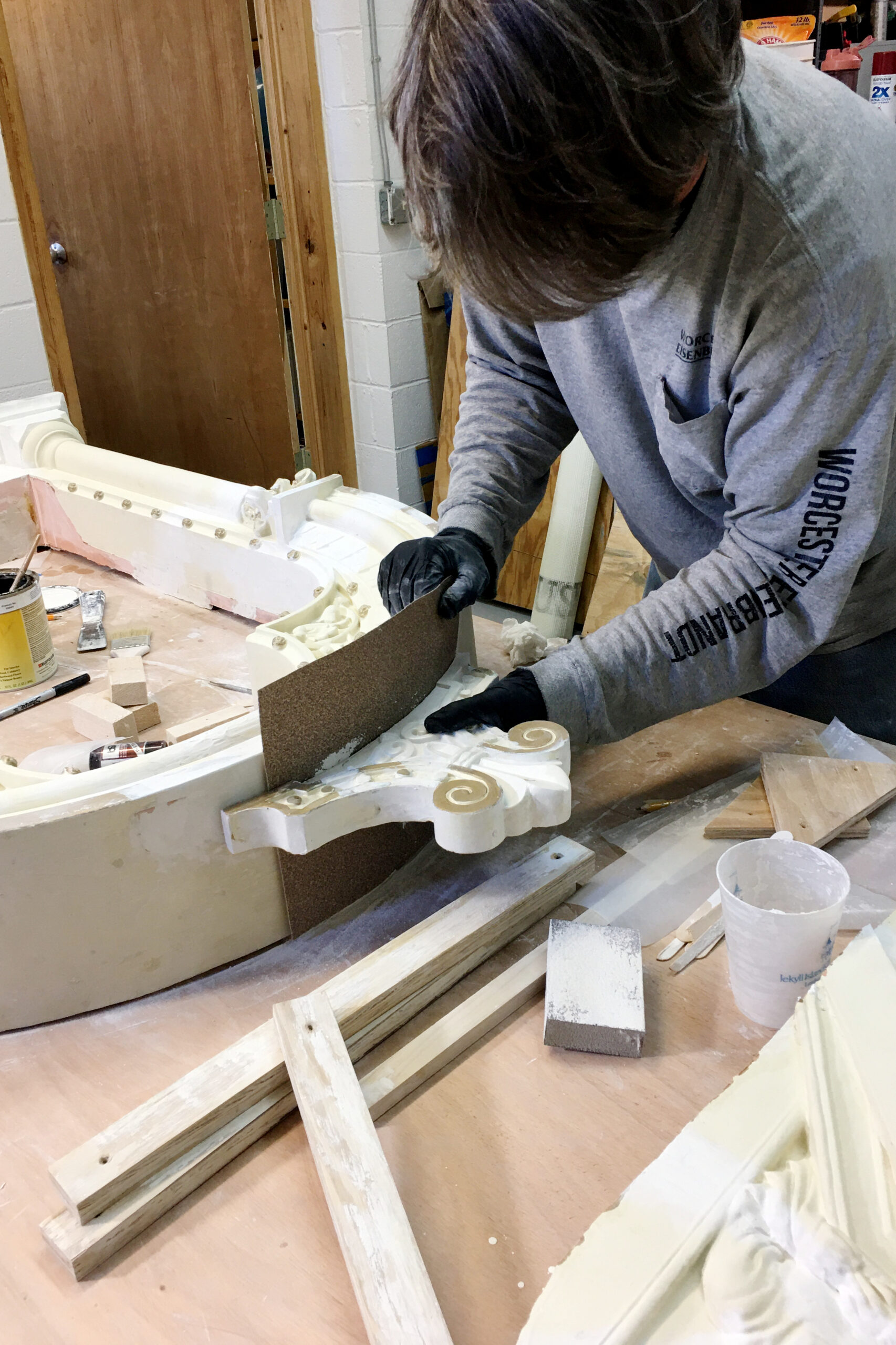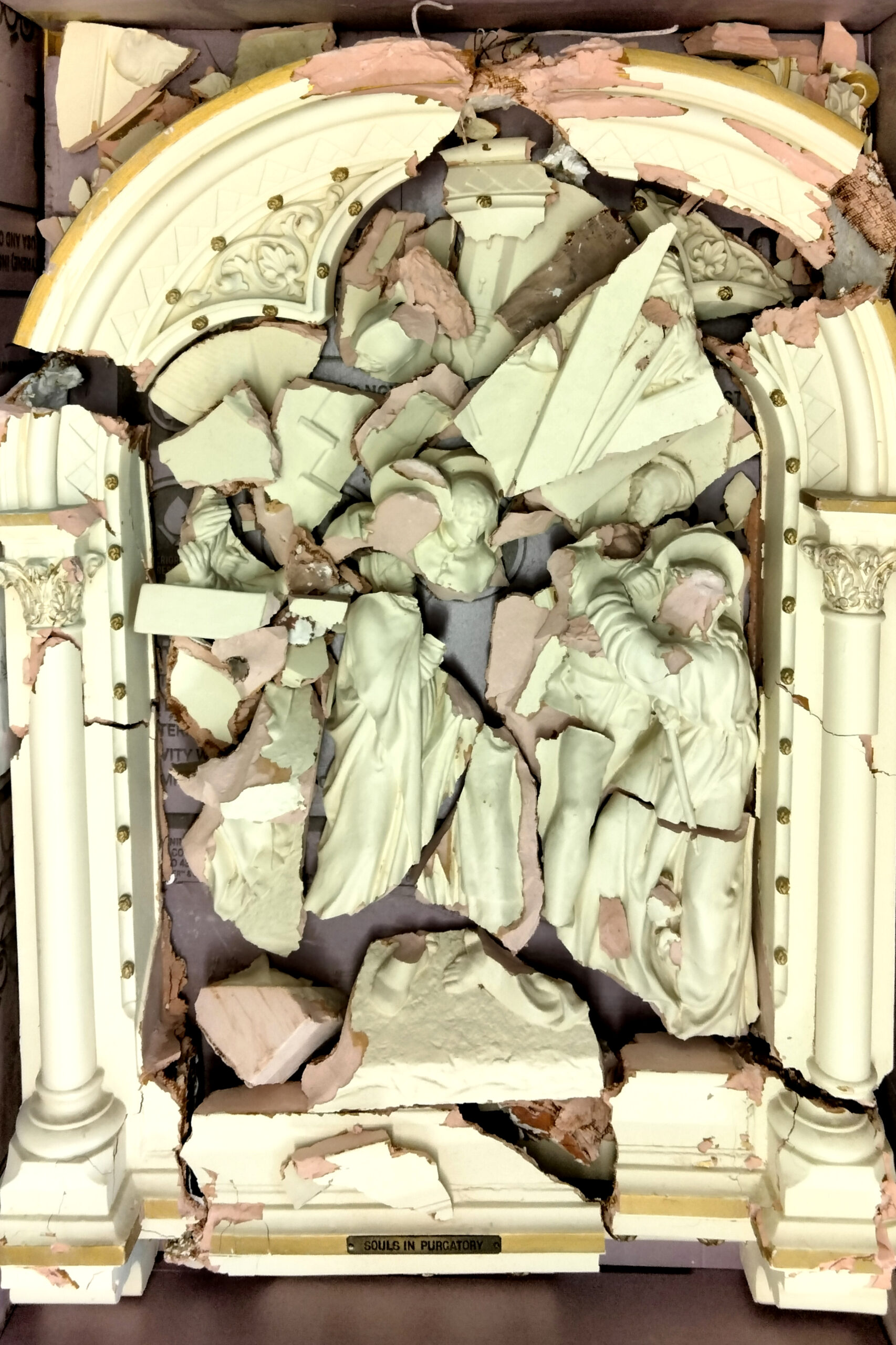 The conservation team first reassembled the remaining pieces that were collected by the parish staff and volunteers.  It was extremely important to get pieces reattached without expanding the size of the final assembly.  Because each glue joint could add volume, the decision not to reinstall the original made it possible to reassemble the outer layer without including some of the interior fragments.  These voids could be filled with plaster after reconstruction to add stability.