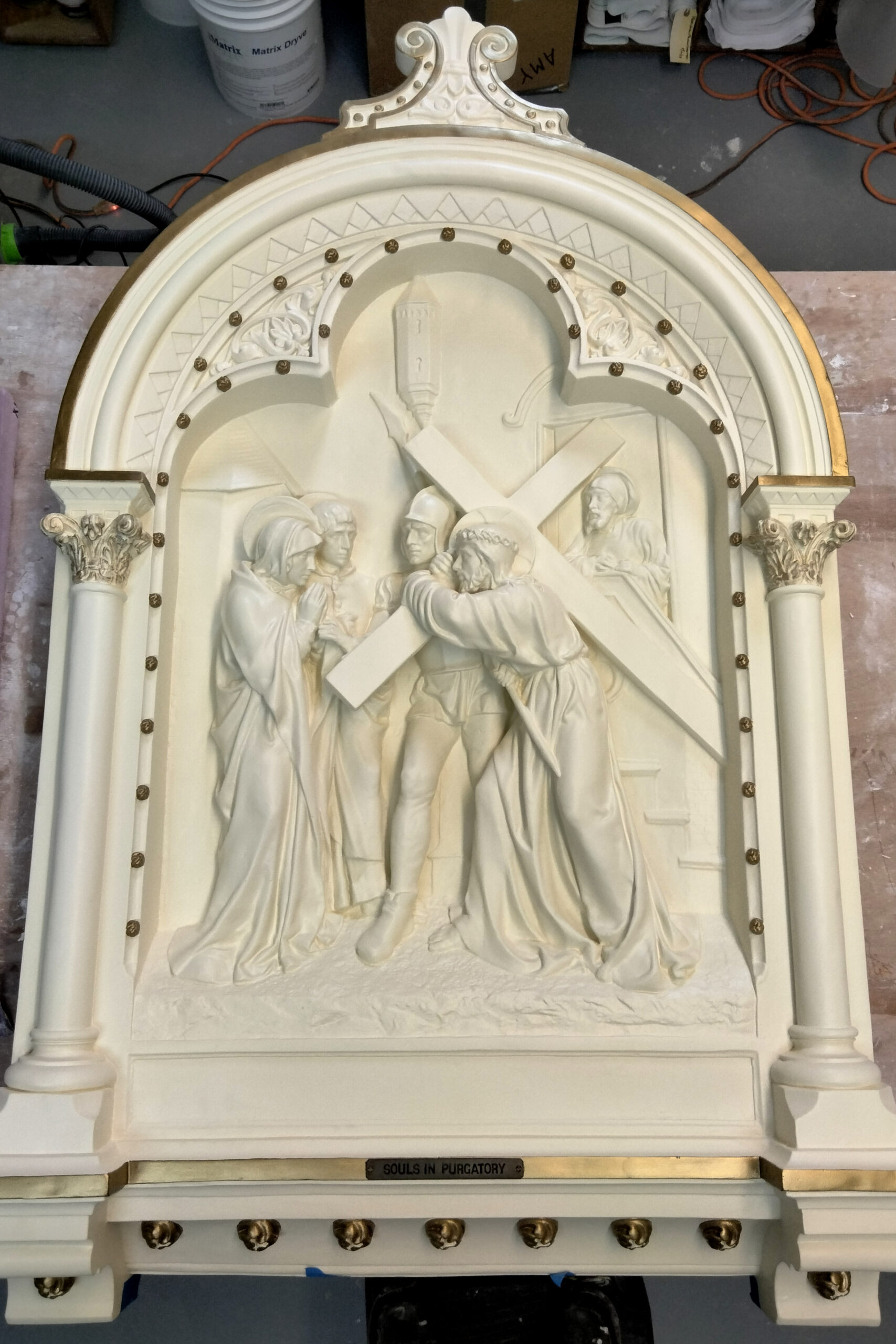 Inevitably, some of the surface fragments were lost, but using cues from the surrounding composition, the losses were resculpted in the style of the original series.  Once that was completed, a mold was made of the entire thing, and a replacement was cast.  After curing, WEI matched the paint and coated the new plaster to match the other 13 stations.