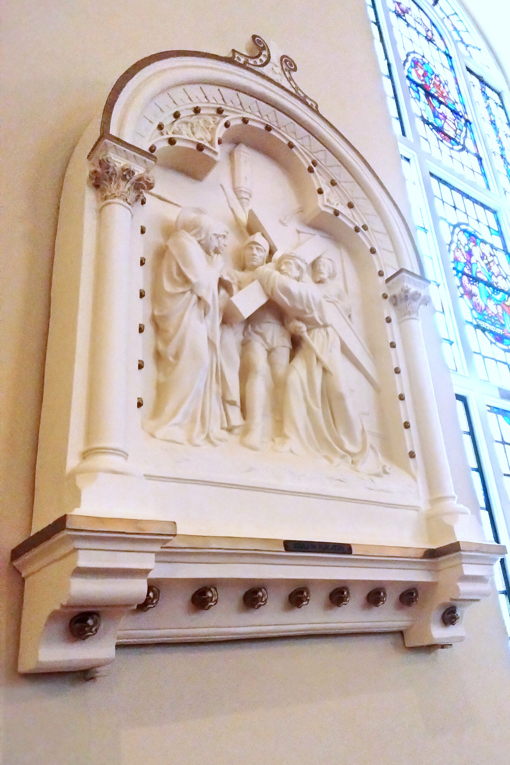 The Stations of the Cross include 14 scenes from the final day in the life of Jesus, and represent a series of meditations.  The stations at St. Vincent de Paul in Baltimore were constructed in Italy in the early 20th century out of plaster, and each one weighs over 100 lbs.  One of the stations, Jesus Meets His Mother, fell off the wall and shattered when it hit the floor.